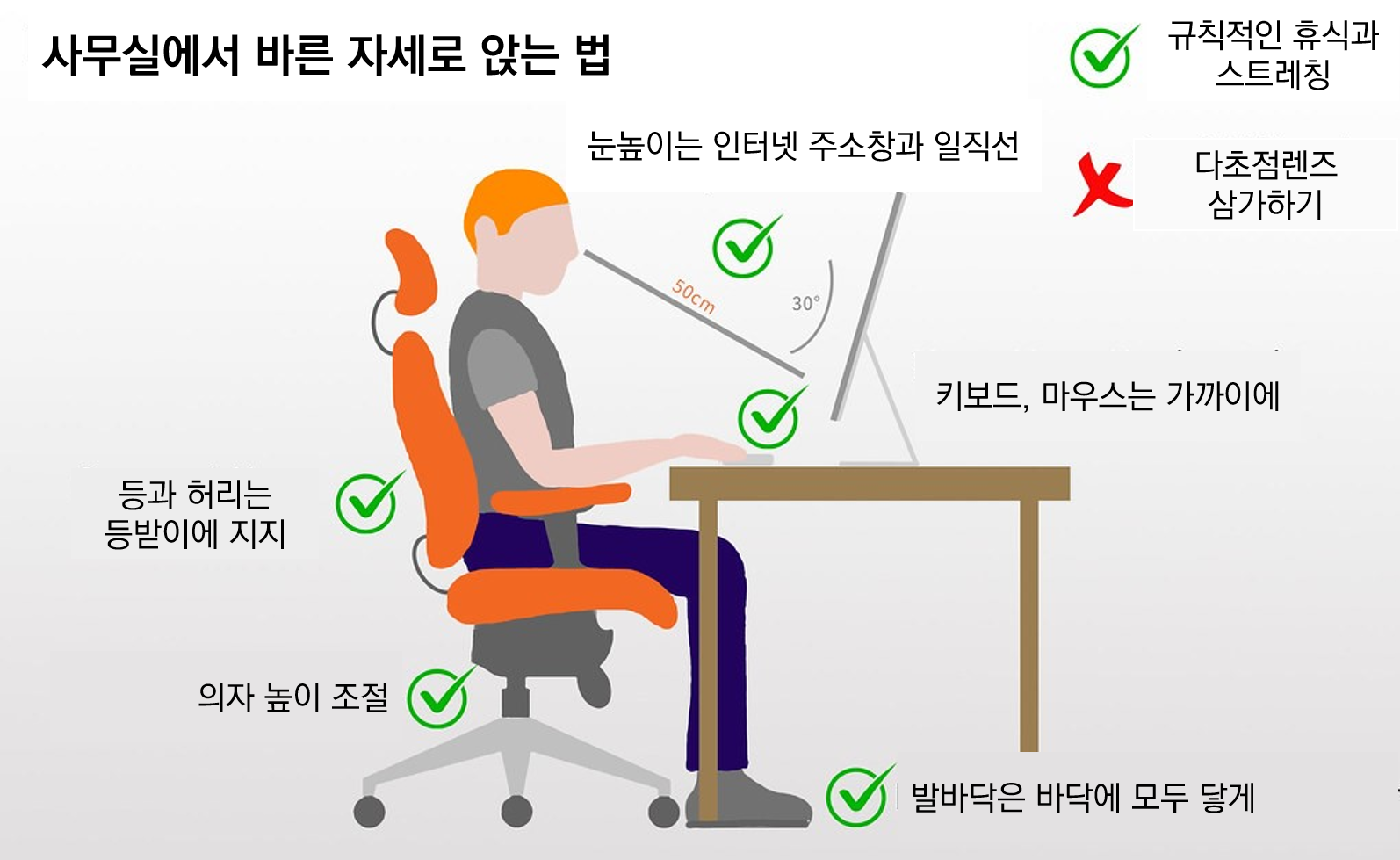 평소에 바른 자세로 앉아서 일하는 것이야말로 정-말 중요합니다. 아래 그림에 나온 가이드를 읽고 자세를 하나하나 고쳐 앉아보세요!
