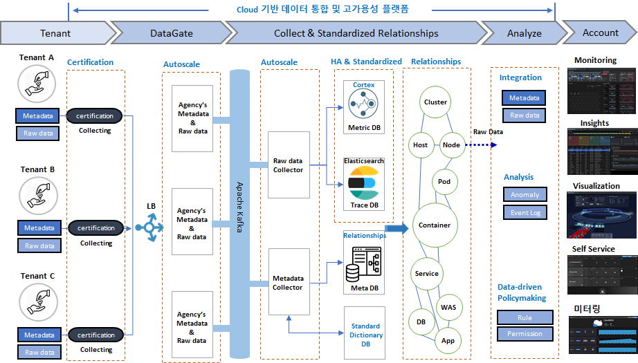 모니터링은 비즈니스의 연속성과 안정성, 그리고 신뢰성을 보장하기 위해 필요한 솔루션입니다. 지금까지 살펴본 IT 환경 변화는 분산된 인프라의 통합 관리와 공유 자원 풀링 등으로 시스템 및 애플리케이션 등의 데이터(메타, 메트릭 등의 Raw data)가 폭발적으로 늘어났으며, 대용량 데이터 실시간 수집 성능과 함께 메타 기반 상호 연관 관계 추적 및 변화 감지가 중요해졌습니다. 이는 On-Premise와 같은 싱글 포인트 장애 분석에서 다차원 관계에서 발생되는 장애 전파의 시작점(근본 원인)을 찾기 어려워졌기 때문입니다. 그리고 다운 타임과 복구 시간 단축을 위해 성능 데이터 기반 이상 탐지(Anomaly Detection), 사후 분석된 장애 패턴 기반의 데이터를 활용한 ML/AI 기반 분석 기능을 제공하는 솔루션 도입이 중요해졌습니다.