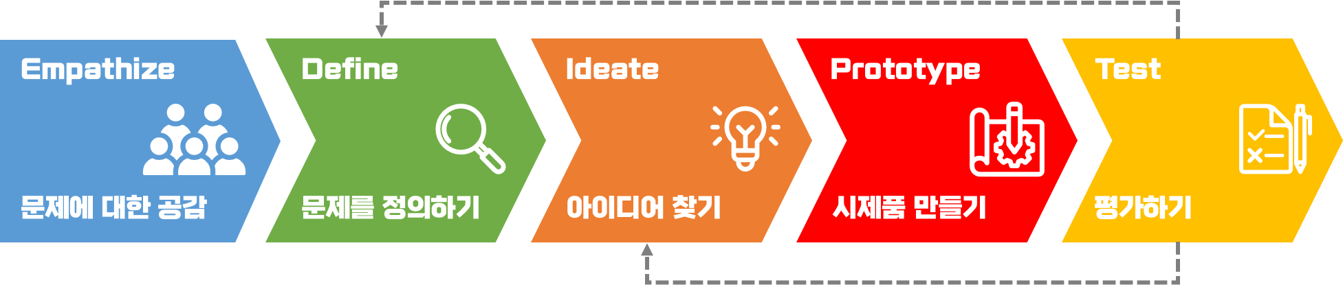 디자인 씽킹을 아시나요? 디자인 씽킹은 사람 중심의 이해를 바탕으로 아이디어를 시각화하고 현실화해 새로운 비즈니스로 이어질 수 있게 하는 방식으로, 총 5단계로 구성되어 있습니다.