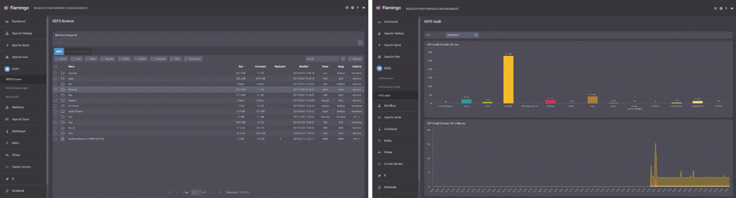 ‘플라밍고’에는 크게 세 가지 기능이 있다. 첫 번째는 시스템을 운영하는 관점에서 필수적인 모니터링 기능이고, 두 번째는 빅데이터를 활용하는 관점에서 사용되는 데이터 분석과 관리 기능, 세 번째는 서버 및 서비스 관리 기능이다. ‘플라밍고’는 대용량 데이터 관리와 활용 및 운영 세 가지 관점 모두에 있어서, 누구나 손쉽게 접근하고 활용할 수 있도록 지원하고 있으며, 이는 대용량 데이터를 다루는 고객들이 ‘플라밍고’를 선택한 이유이기도 하다. HDFS 브라우저는 HDFS 상의 디렉터리 및 파일을 관리하는 Flamingo의 핵심 기능이다. GUI 환경 상에서 손쉽게 파일을 업로드하고 다운로드할 수 있으며, 하나의 디렉터리에 수십만 개의 파일이 있더라도 UI 문제없이 거뜬히 표시한다. Hive SQL Editor 기능을 제공하여 대용량 데이터의 손쉬운 검색 및 분석 기능 또한 제공하고 있으며, 파일시스템 감사(Audit) 기능을 통해 HDFS Browser를 이용한 작업 내용을 확인하고, 원하는 기간의 HDFS 데이터 사용량 추이까지 확인 가능하다.