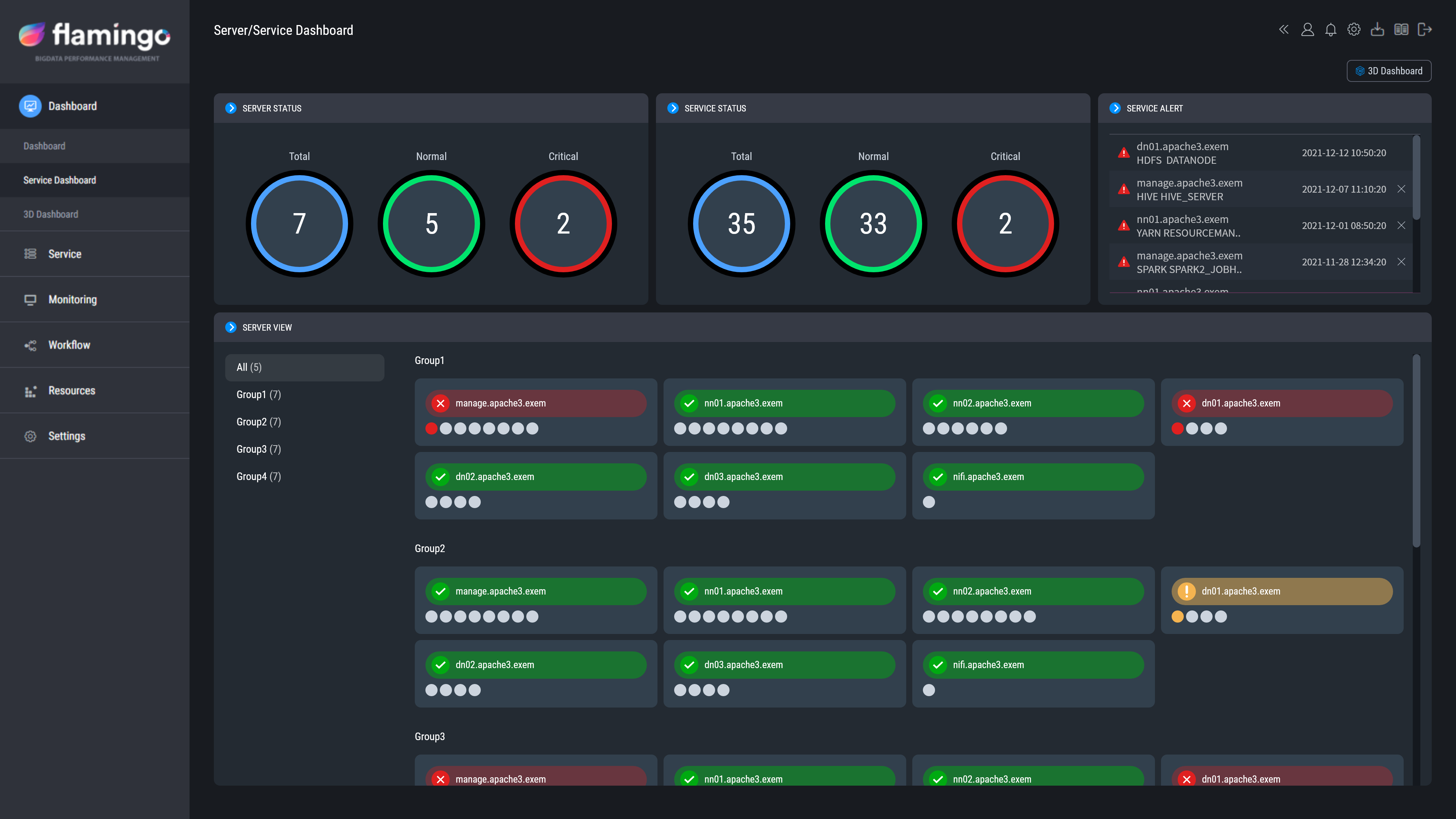 플라밍고는 특히, 서버 및 서비스 관리에 주목했다. 하둡 에코 시스템을 설치하고 운영하기 위해서는 적게는 5대에서 많게는 수백 대 서버들이 필요하다. 또한, 서버마다 여러 개의 소프트웨어가 설치되고, 기업 운영 담당자들은 수많은 서버에 접속하여 서버 및 서비스 상태를 확인할 수 있는 명령어를 실행해야 할 것이다. 엑셈의 ‘플라밍고’를 사용하면 하둡 에코 시스템에 설치된 수많은 소프트웨어와 서버들의 상태 정보를 쉽게 확인할 수 있다. 여기에 ‘플라밍고’는 각종 모니터링 뷰와 3D 대시보드를 통해 서버 리소스 현황과 소프트웨어의 상태 정보 등을 직관적인 UI/UX로 제공한다. 이는 빅데이터 운영 담당자가 일일이 수많은 서버에 접속해 서버 및 서비스의 상태 확인 명령어를 실행할 필요 없이도 신속한 장애 대응을 가능하도록 한다.