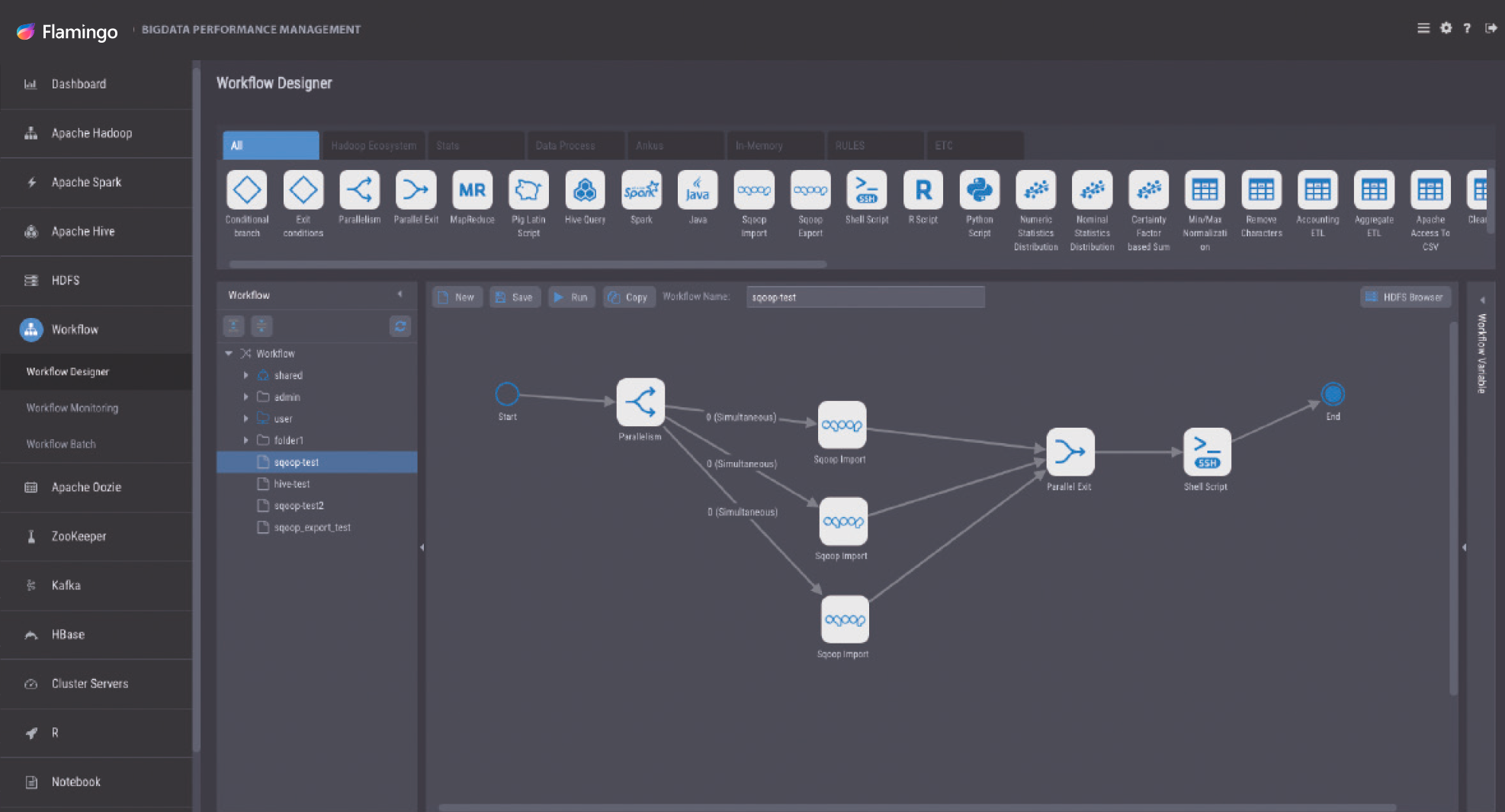 ‘플라밍고’ 사용자는 워크플로우 디자이너를 통해 GUI 기반으로 손쉬운 드래그 앤 드롭 작업으로 작성하기 어려운 분석 워크플로우를 간단히 작성하고 테스트까지 진행할 수도 있다. 워크플로우 디자이너는 다양한 모듈(hive, Java, Shell, Python, Spark)을 활용, 빠르게 Job Flow를 설계 구성하여 예약 혹은 즉시 실행 가능하며, Job 성공 여부에 대한 정보도 제공한다.
