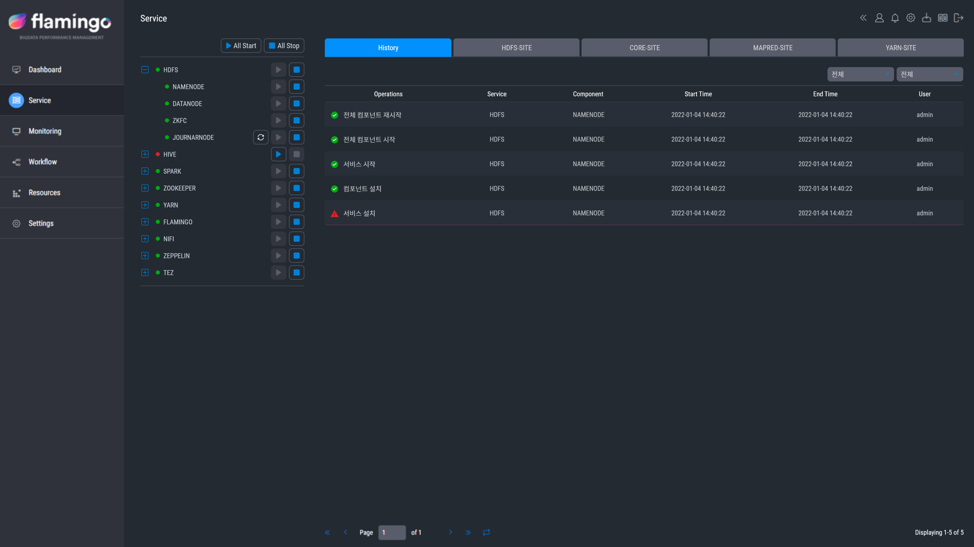 또한, 하둡 에코 시스템을 손쉽게 운영하기 위해 반드시 서비스 실행/종료 제어, 각 서브시스템의 설정 정보 변경 관리 등의 기능이 필요하다. 플라밍고는 이를 WEB UI 환경에서 관리할 수 있도록 하는 환경을 제공하고 있다. 서비스 실행/종료 시 서브시스템 간의 연관 관계에 따라 자동 순차 서비스 실행/종료가 되며 전체 서비스에 대한 일괄 실행/종료 기능도 제공한다. 운영 시 에코 시스템 설정에 대한 히스토리 관리를 통해 보다 안정적인 시스템 운영 및 처리가 가능하다.