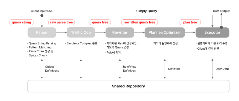 postgres 프로세스는 Client로부터 SQL(Query string)을 전달받으면 아래와 같은 5개의 과정을 거쳐 SQL을 처리하며 그 결과를 Client로 반환합니다. 각 과정에서는 문법체크 및 의미분석, 최적화 작업 등을 수행하며, 세부적인 내용을 각각 확인해 보도록 하겠습니다.