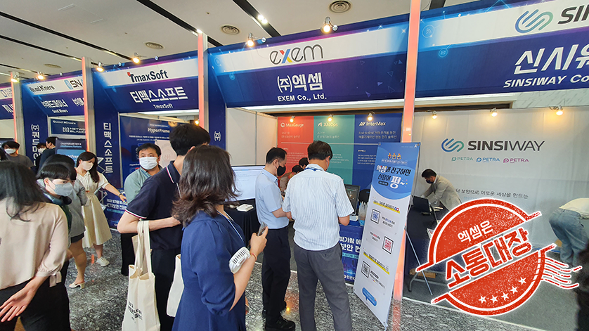 전시부스는 엑셈을 비롯해 오라클, 한국IBM, 인텔코리아, 한국휴렛팩커드, 메가존 클라우드 등 글로벌 기업 및 지역 기업 41개사가 참여했습니다. 엑셈은 자회사인 신시웨이와 부스가 나란히 배정되어 함께 솔루션 홍보를 진행했습니다. (자리 뽑기는 랜덤~, 이것은 인연~)