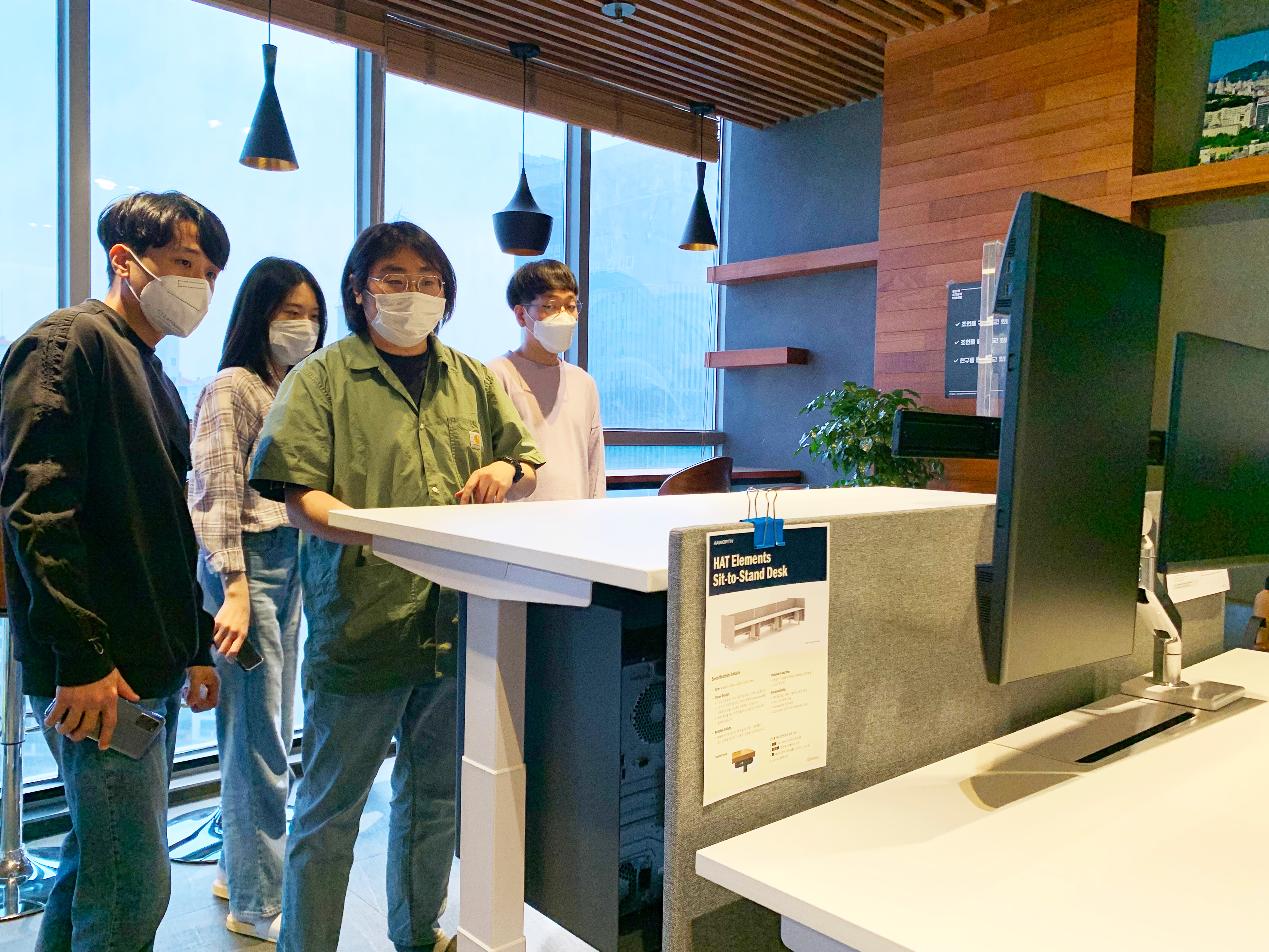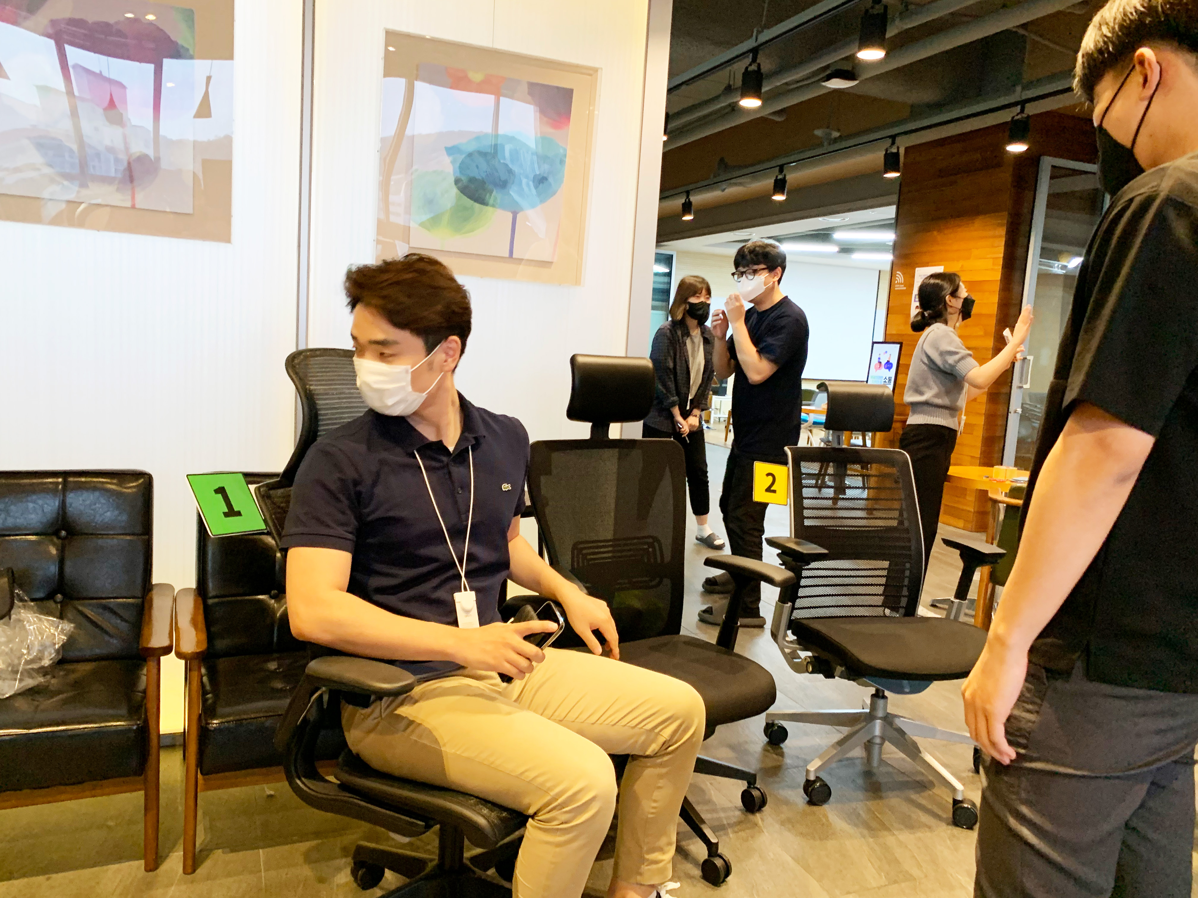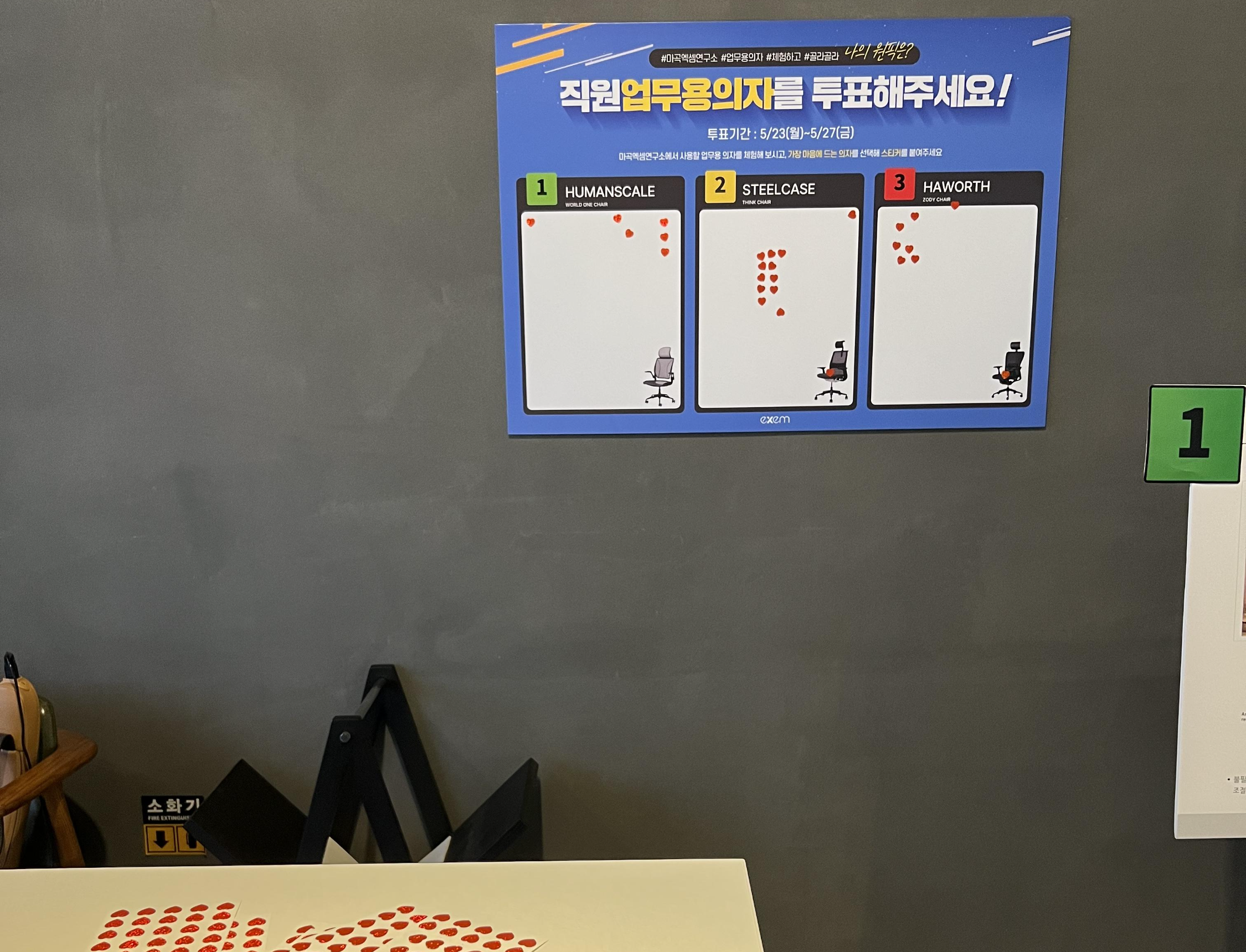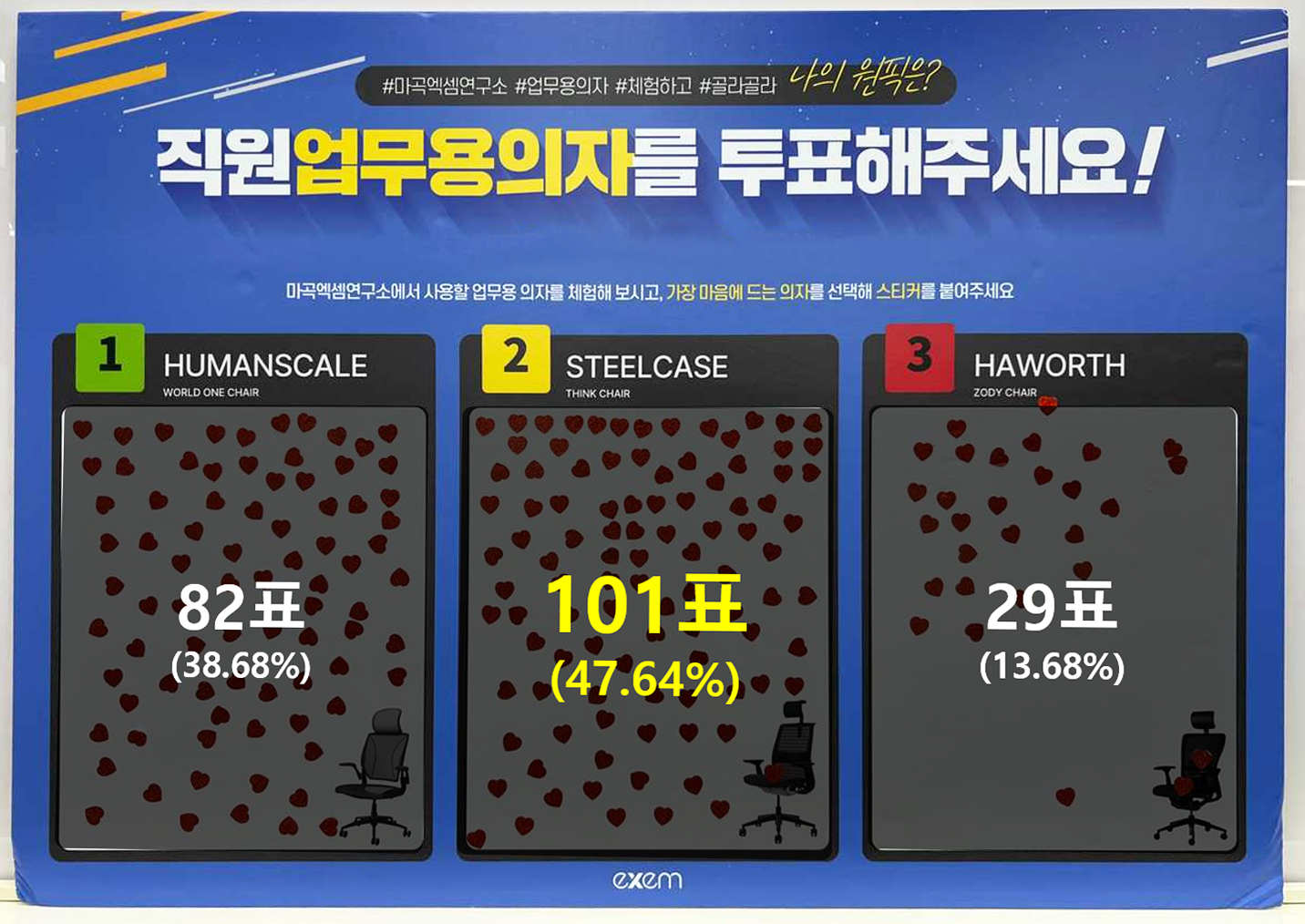 의자를 체험 후에 가장 마음에 드는 의자를 투표해서 집계 결과를 마곡센터에 반영하기로 했습니다. 5일간 임직원의 참여율은 80% 이상이었습니다. 사실 의자는 내 몸에 맞게 최적화되게 세팅하는 게 중요한 지라 많은 임직원들이 직접 사용하게 될 의자를 비교해 보며 신중하게 고민했습니다. 어떤 이는 체험 의자에 앉자마자 본인도 모르게 이렇게 말합니다. "이야~"
