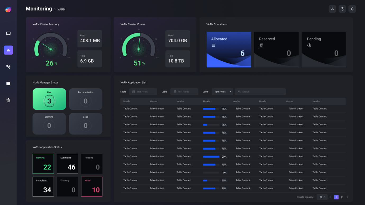 클러스터에 구성된 노드 매니저의 상태를 요약된 수치로 표시합니다. - Yarn Application List