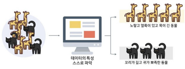 반대로 비지도 학습(Unsupervised Learning)은 훈련 데이터에 레이블(정답)이 없는 학습 방법으로, 크게 군집, 차원 축소 등이 있다. 군집(Clustering)은 비지도 학습에 있어서 널리 쓰이는 알고리즘 중 하나인데, k-means(K-평균), DBSCAN, Hierarchical cluster analysis(HCA), Isolation forest 등이 있다. 위에서 든 예와 다르게 기린과 고양이가 레이블이 되어있지 않은 데이터에서 비지도 학습 알고리즘은 기린 혹은 고양이의 특성을 추출해서 분류를 한다.