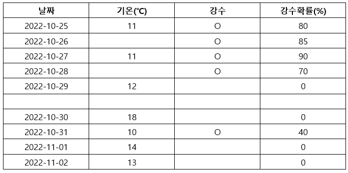 우선, 가장 먼저 값이 하나도 없는 행을 봐주세요. 바로 위 ‘날짜’가 10월 29일이고, 아래가 10월 30일이므로 이 행(Row)은 단순 제거할게요. 다음으로 ‘강수’가 비어 있는 곳을 봐주세요. 모두 ‘강수 확률’이 0인 경우예요. 그렇다면 이 결측은 ‘X’로 채워줄게요. 마지막으로 ‘기온’이 비어 있는 곳을 봐주세요! 기온은 보통 연속적이므로 직전 기록과 직후 기록의 평균으로 채우면 어떨까요?