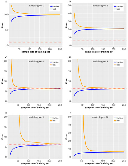 위 그림은 저차원 회귀모델부터 고차원 회귀모델까지의 학습 곡선이다. 빨간 점선은 목표하는 오차 지점을 의미한다. 1차원, 2차원 회귀모델의 경우 모델이 단순해서 목표한 오차 지점까지 훈련이 진행되지 않음을 확인할 수 있다. 이를 모델이 과소적합 되었다고 말한다. 반면, 9차원, 10차원 회귀모델의 경우 과대적합된 모델에 해당한다. 과대적합된 모델의 특징은 훈련 데이터의 오차가 매우 낮은 것이다. 또 다른 특징은 훈련 데이터와 검증 데이터 곡선 사이에 공간이 있는 것이다. 이 말은 검증 데이터에서보다 학습 데이터에서의 성능이 좋다 것으로 과대적합을 의미한다. 이상적인 모델은 4차원 회귀모델로 보인다. 4차원 회귀모델의 경우 목표하는 오차지점에 도달했으며 훈련 데이터와 검증 데이터 사이에 공간이 거의 없음을 확인할 수 있다.