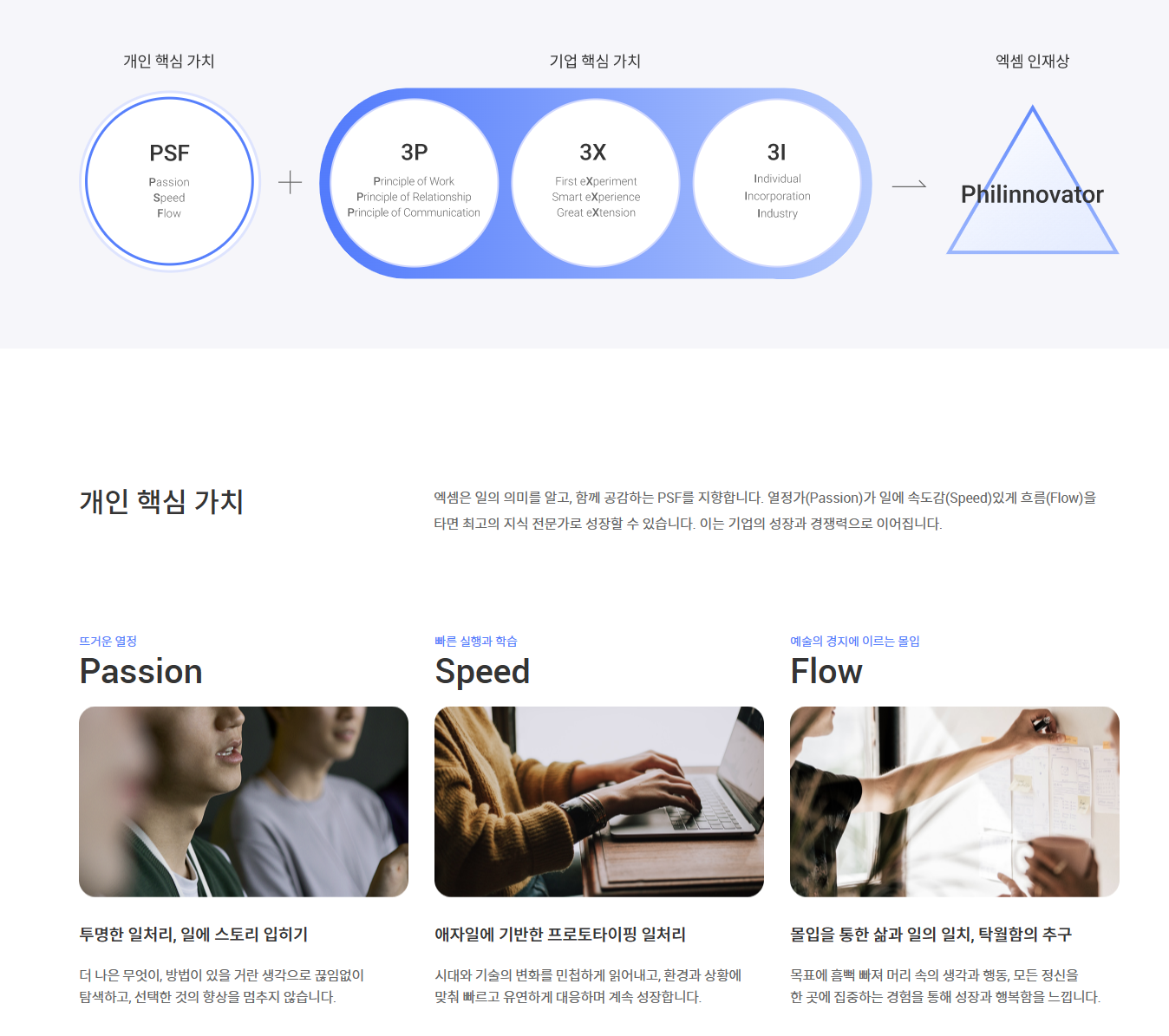 엑셈은 구성원 모두가 철학하는 마음과 혁신하는 마음을 통해 성장하는 기업입니다. '개인의 성장이 곧 회사의 성장'이라는 기업의 핵심 메세지를 전달하고 있습니다.