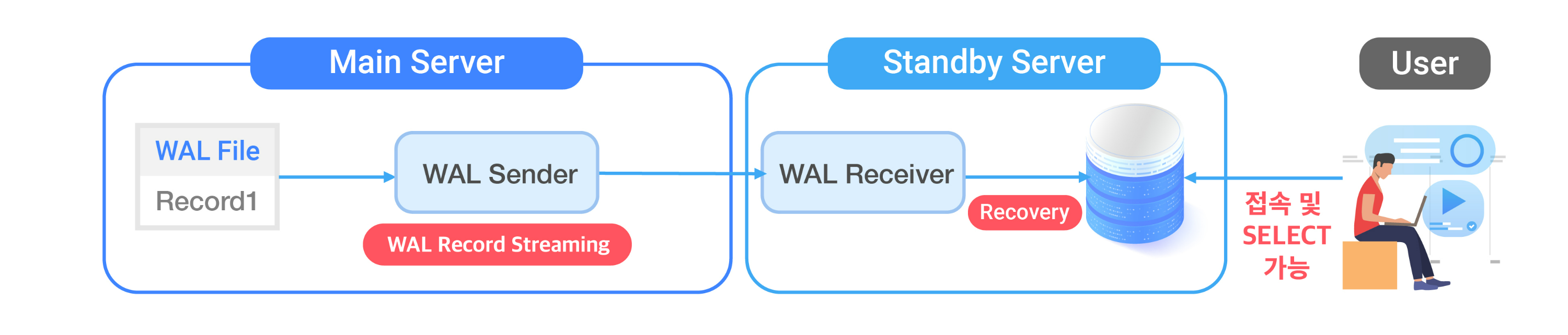 파일이 아닌 WAL Record를 전달하기 위해서, Main Server에는 WAL Sender, Standby Server에는 WAL Receiver라는 전담 프로세스가 필요하며, 이 프로세스들이 Server 간의 동기화를 수행합니다.