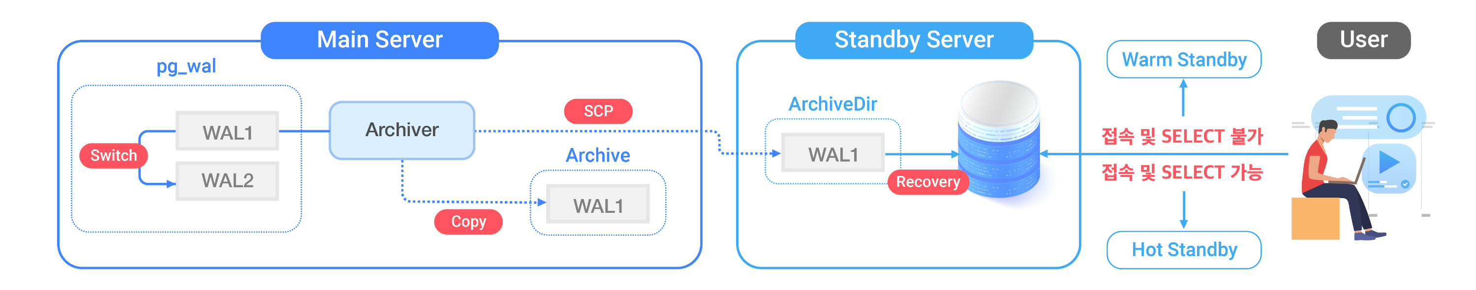 - Warm Standby 구성 시 Standby Server에 접속 및 SELECT 불가 (Hot Standby는 해당사항 없음)