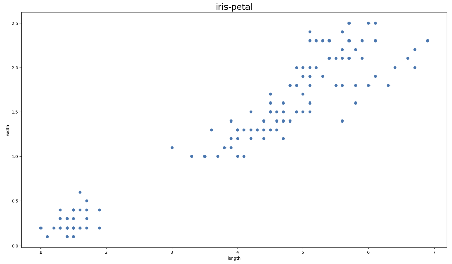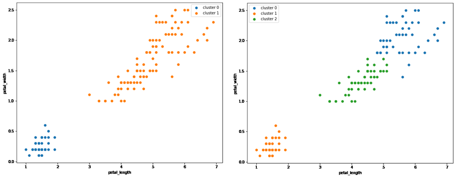 Out[2] 에서 petal (꽃잎) 에 대한 데이터만을 가지고 데이터의 분포를 해석하자면, 왼쪽 아래에 뭉쳐있는 데이터 집단과 우상단에 뭉쳐있는 나머지 데이터 집단, 총 2가지 군집으로 분리하는 것을 기대할 수 있겠습니다.