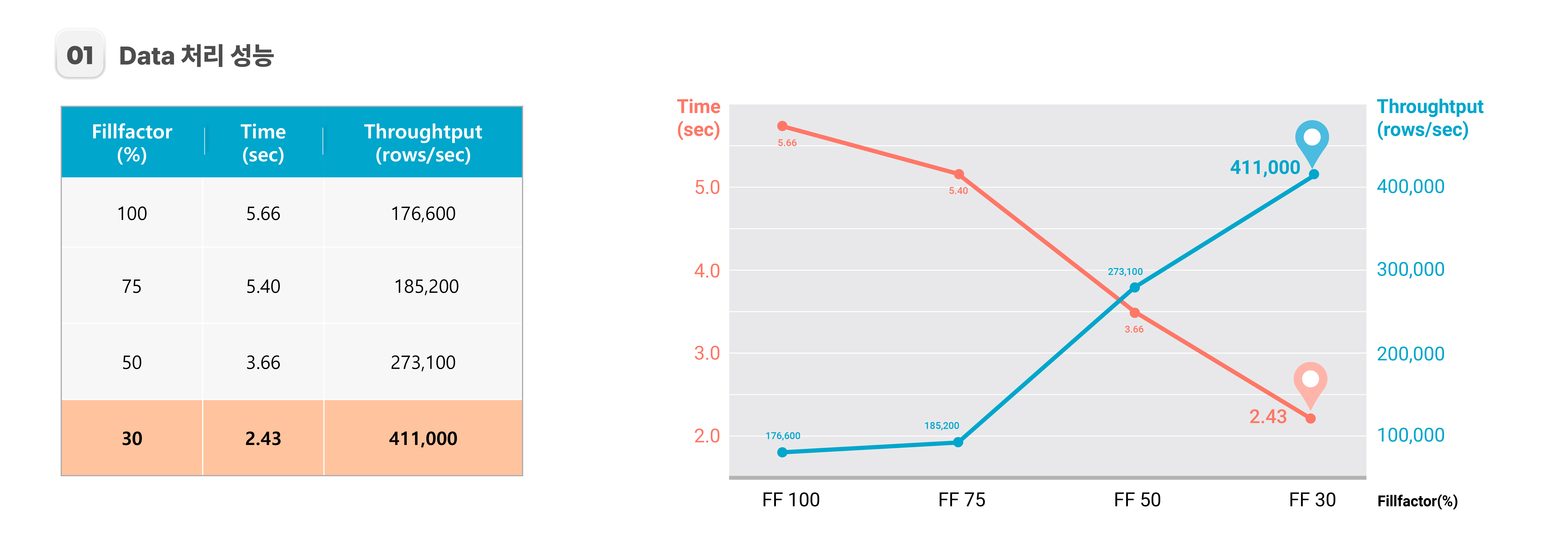 위 결과를 보면, Update가 지속적으로 발생하는 상황에서는 설정된 FillFactor값이 작을수록 Update 처리속도가 빠르며 (Time), 같은 시간 동안 훨씬 더 많은 양의 Data를 처리할 수 있다는 것을 확인할 수 있습니다. (Throughtput)