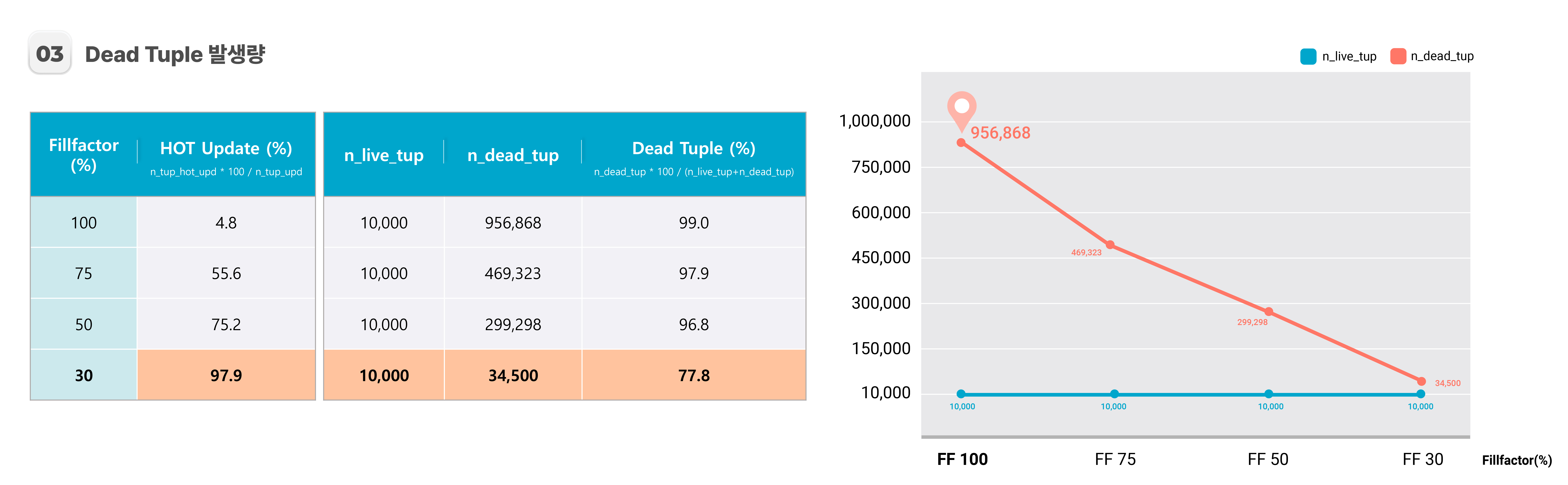 Fillfactor가 작을수록 페이지 내 업데이트를 위한 공간이 많이 남아있으므로 변경 이전의 Tuple이 동일 페이지에 저장될 가능성이 높기 때문입니다. - Fillfactor가 작을수록 Dead Tuple 수는 줄어듭니다.