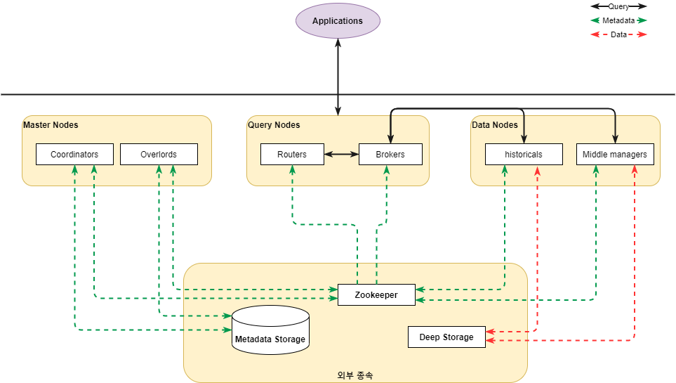 historical과 middle manager 프로세스가 실행되며, 쿼리 가능한 모든 데이터를 저장