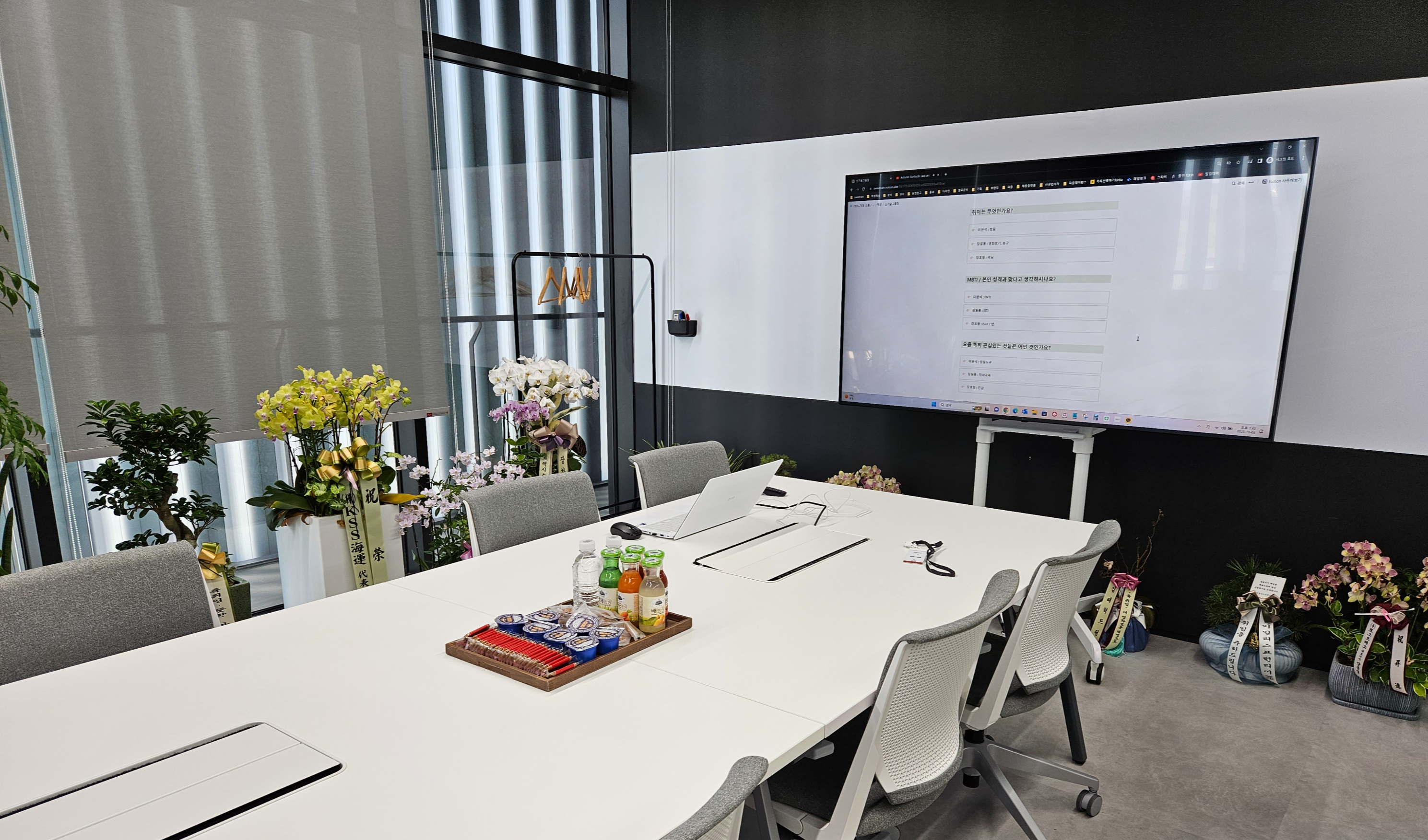 조금 더 툭 터놓는 소통을 위해 대표이사실 화면에 서로 공유할 설문을 띄우고, 팀마다 다른 음악을 틀어 분위기를 전환합니다. 보통 1시간에서 길게는 2시간 반까지 소통이 진행됩니다.