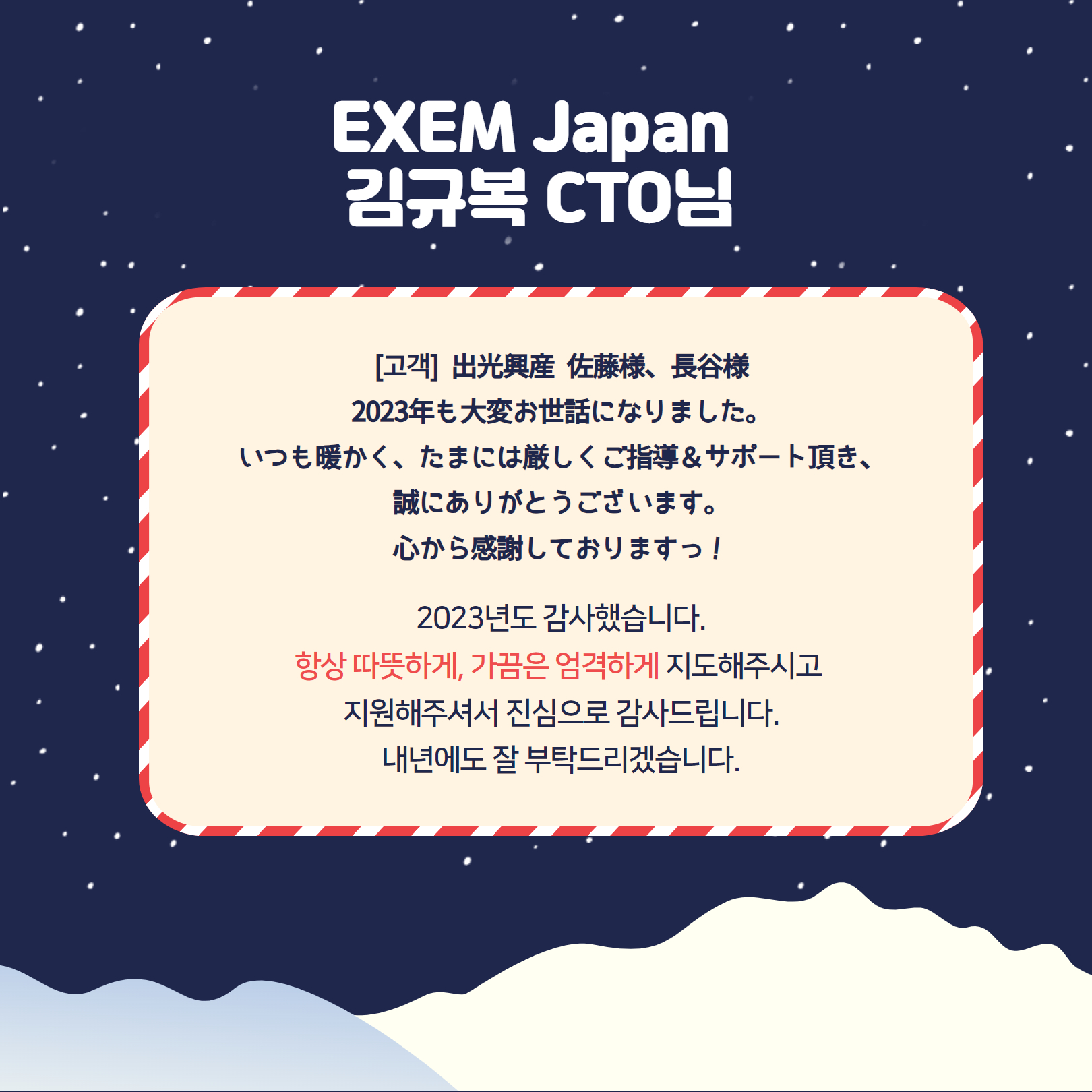 내리는 눈이 연말을 실감케 합니다. 늘 이맘 때면 무언가 마무리되는 아쉬움과 이루어낸 것들에 대한 뿌듯함이 함께 스칩니다. 생각해보면 또 무탈히 한 해가 지나가는 것도 가족과 동료들 덕분이고, 응원해주는 누군가 덕분인 것 같습니다. 캐롤이 들리고, 추운 날씨로 따뜻함이 그리워질 때, 올해도 덕분에 행복했다, 감사하다 인사 전하고자 합니다. 엑셈도 정말 많이 감사합니다.