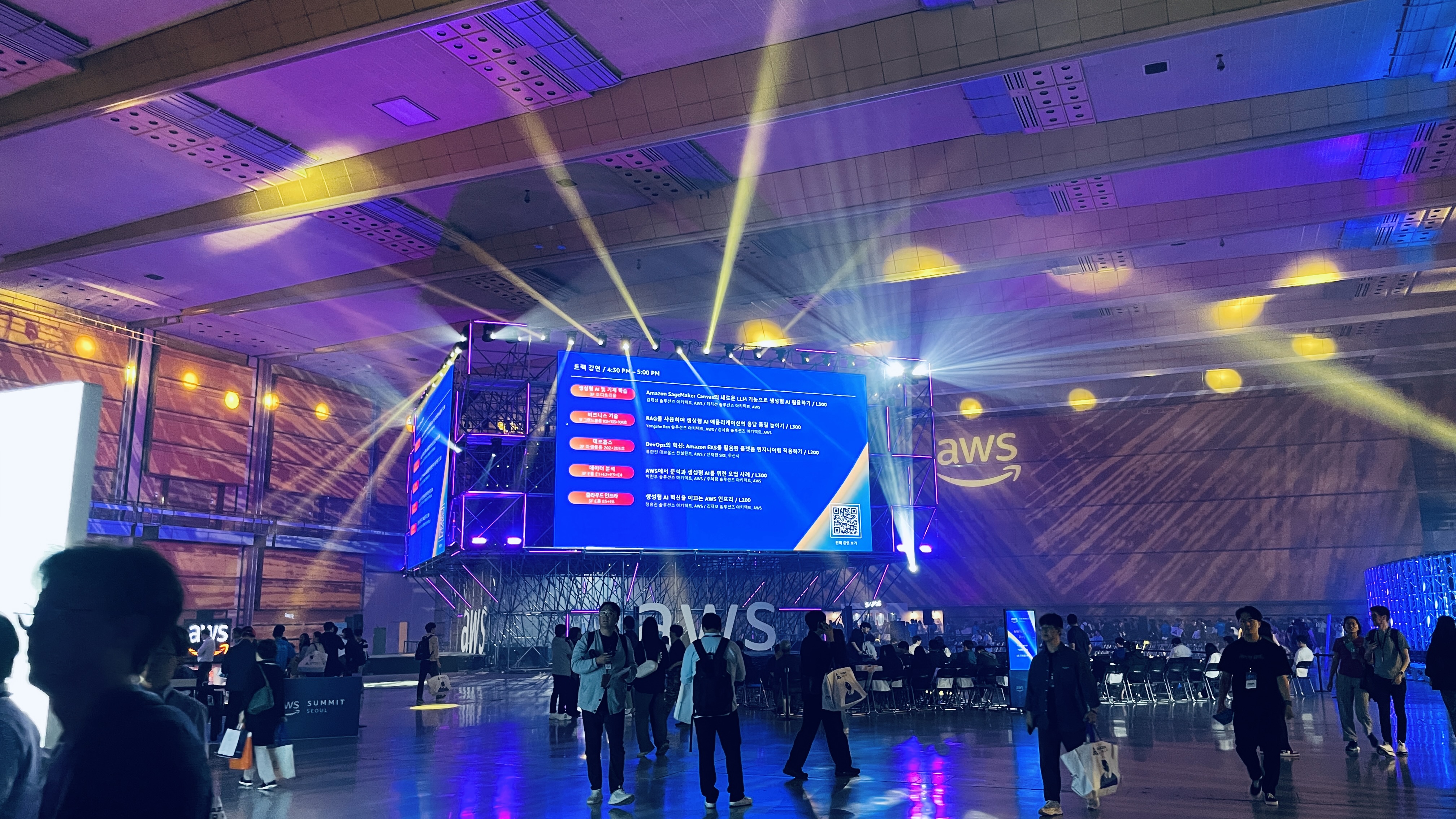 올해 10주년을 맞이한 AWS Summit은 IT인들의 향연()이라고 해도 과언이 아닐 정도로 한국뿐만 아니라 해외에서도 많든 분들이 찾아오셨어요. 은근한 조명과 행사장에 시종일관 깔렸던 BGM까지 굉장히 힙하고 활기찬 느낌이라 이틀 내내 에너지 뿜뿜한 컨디션으로 마주하게 되었어요. 엑셈 부스로 안내해드리기에 앞서, 이번 Summit의 전반적인 후기를 공유할게요.
