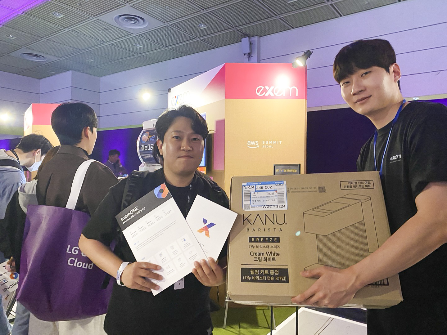 몇 년만에 오프라인에서 고객분들과 만나는 자리라 엑셈 부스에 오신 한 분 한 분의 양손을 가득 채워드리고 싶은 마음이 컸어요! 그래서 준비한 뽑기 이벤트. 기프트로 캡슐 커피머신과 스벅 상품권 5만원권, 선풍기, 엑셈 제작 티셔츠 등을 아낌없이 준비했습니다. SNS 채널 구독만 해도 exemONE 장바구니를 겟하셨구요.