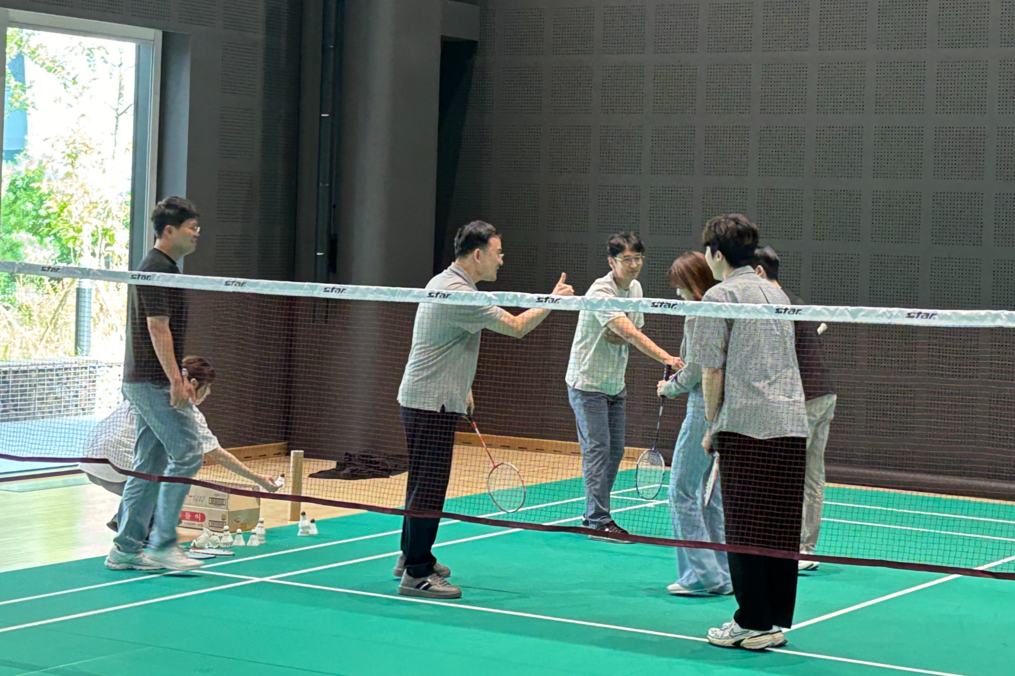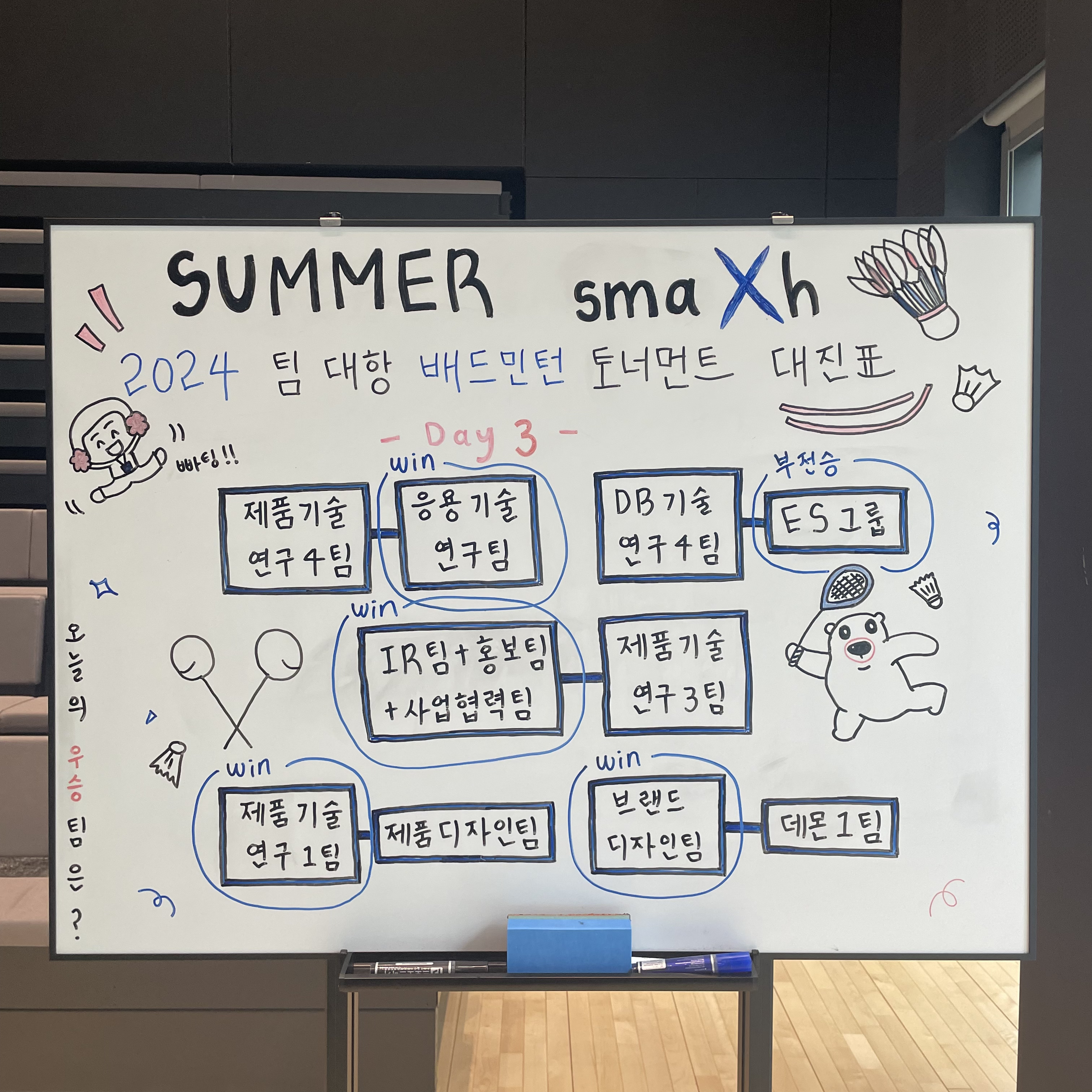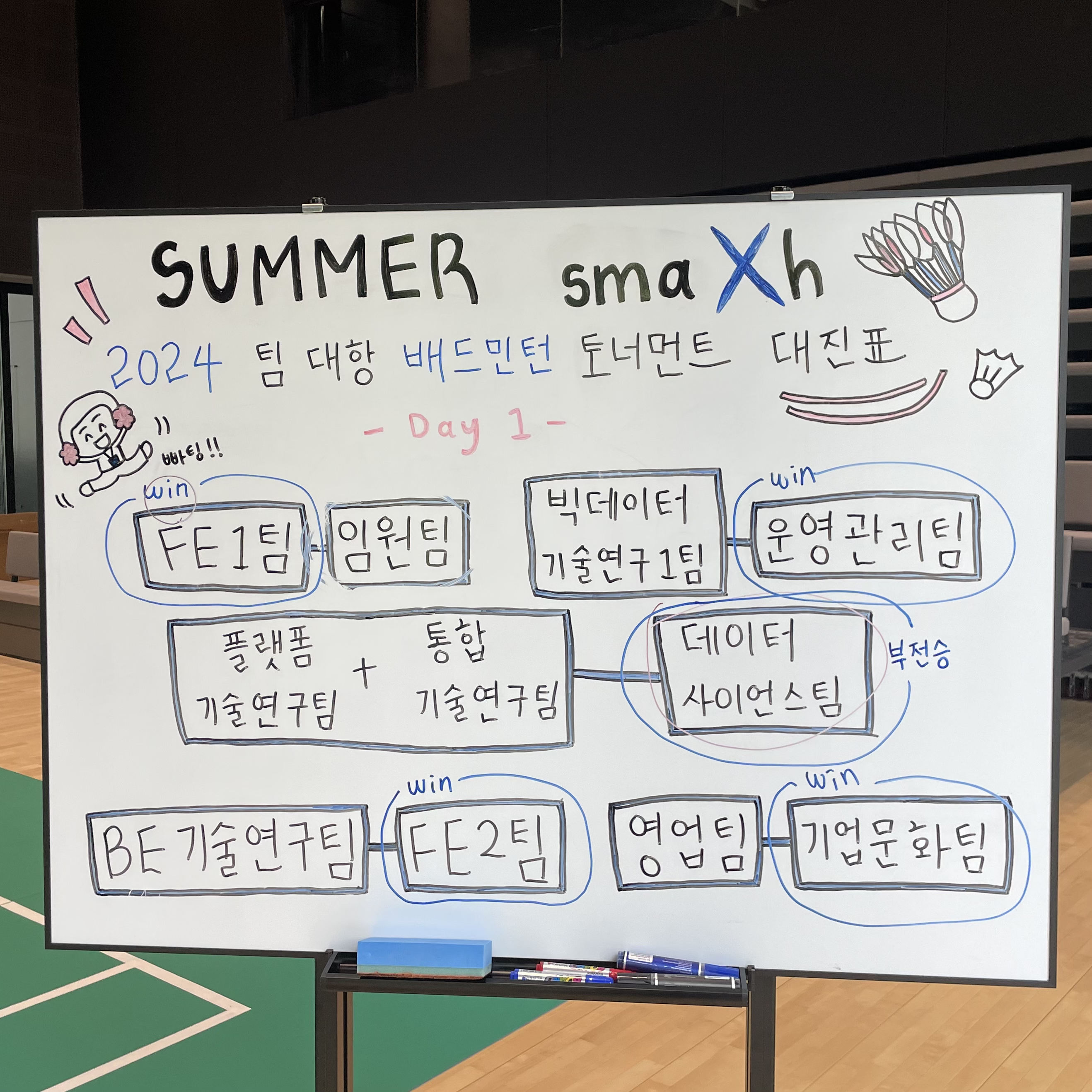 exemONE 고도화 작업에 대한 열정, 다시 돌아온 오프라인 세미나 준비를 위한 열중, 팀 대항 배드민턴 토너먼트 열기로 가득찼기 때문입니다. 엑셈 사옥의 1층 필리노베이터홀은 올해 3월부터 배드민턴 코트로 변신했습니다. 엑세머들이 평소에도 배트민턴을 굉장히 즐기는 가운데, 이 번 여름 더위를 제대로 '뿌시기' 위해 2024 Summer SmasXh 대회를 준비했습니다.