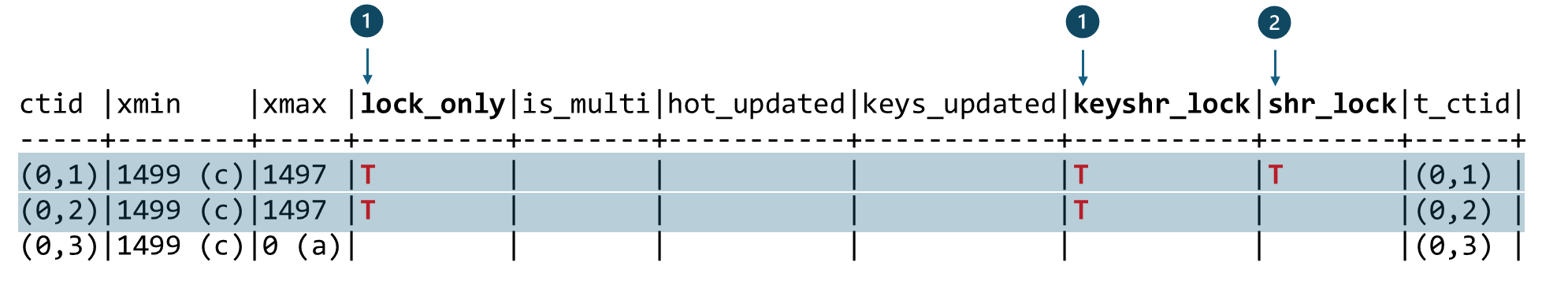 ①두 Command에 의해 ctid(0,1)과 ctid(0,2)에 해당하는 Tuple의 lock_only와 keyshr_lock 값이 T로 설정 것을 볼 수 있습니다. 그리고 ②’FOR SHARE’ 모드로 Row-level Lock을 설정한 Tuple ctid(0,2)에는 shr_lock이 추가로 설정되었습니다.