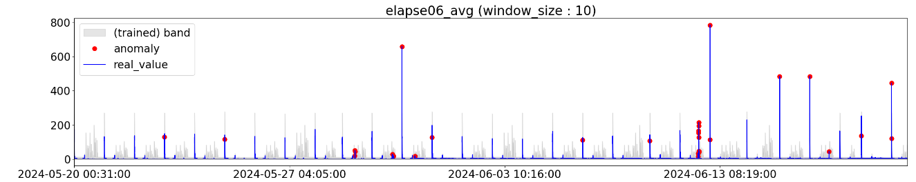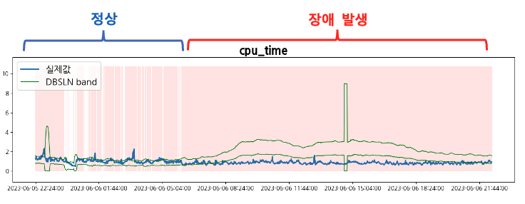 아래는 각 지표별로 통계적 방법을 통해 각 시간대에 정상 범위(DBSLN band)를 설정하고, 특정 지표가 이 범위를 벗어났을 때 이상 시점으로 판단한 결과를 시각화한 도표입니다. 그러나 이러한 접근법은 정상 상태와 장애 발생 시점을 정확히 추론하지 못하며, 실제로 큰 이상이 발생하지 않았음에도 불구하고 오탐(False Positive)을 유발하는 결과를 초래하였습니다. 이러한 한계는 추론 시스템의 안정성과 신뢰성을 저해할 수 있습니다.