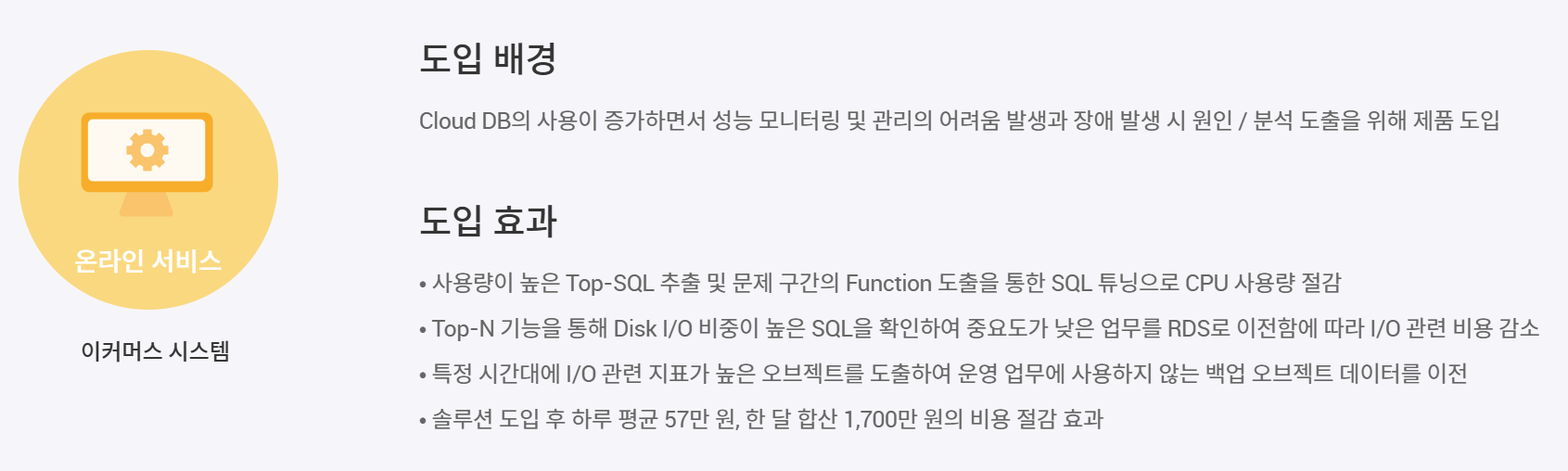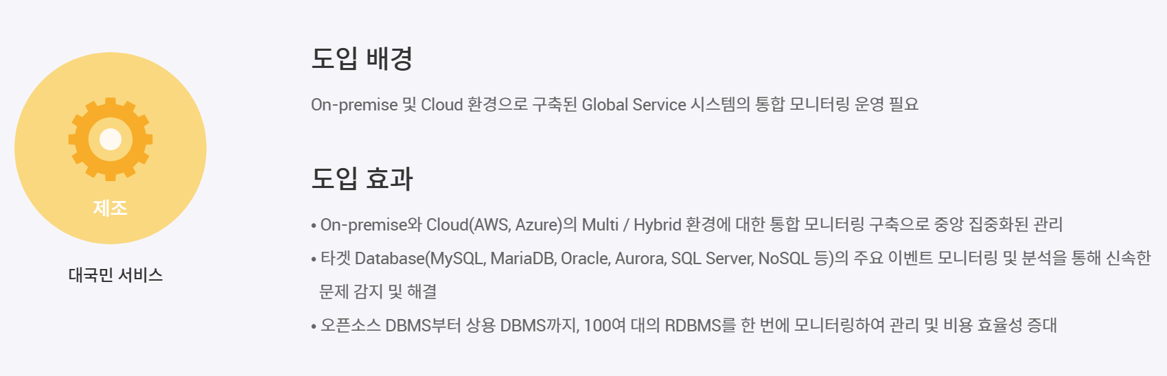 exemONE은 현재 여러 고객사에 성공적으로 도입되어 운영 효율성을 크게 향상시키고 있습니다. 국내 최대 규모의 제조사의 경우 RDBMS 300여개의 모니터링 환경 구축을 제안 받아 진행 중, 전사차원의 확대로 이어지며 현재 최대 800여 대상을 모니터링하기 위해 적용되고 있습니다. 통합 모니터링 구축으로 중앙 집중화된 관리가 되어 관리 및 비용 효율성 면에서 크게 만족하고 있습니다. 예상치 못하는 어려움과 난관은 늘 존재하지만 엑셈은 고객과의 긴밀한 협업을 통해 고객이 필요한 제품을 만들고 그러한 환경을 구축하고자 노력하고 있습니다. 지금까지 고객의 비즈니스 목표 달성에 엑셈 솔루션이 큰 기여를 해 왔듯, 앞으로도 지속적인 혁신과 지원을 통해 더 많은 성공 사례를 만들어 가겠습니다.