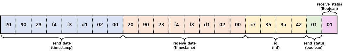 ordering_col 테이블은 Tuple 헤더 24Btye를 제외하고 22Byte의 크기로 저장되었습니다. t_date 결과는 아래와 같이 구분됩니다. 테이블 생성문으로 예상해 본 Tuple의 크기와 동일합니다.